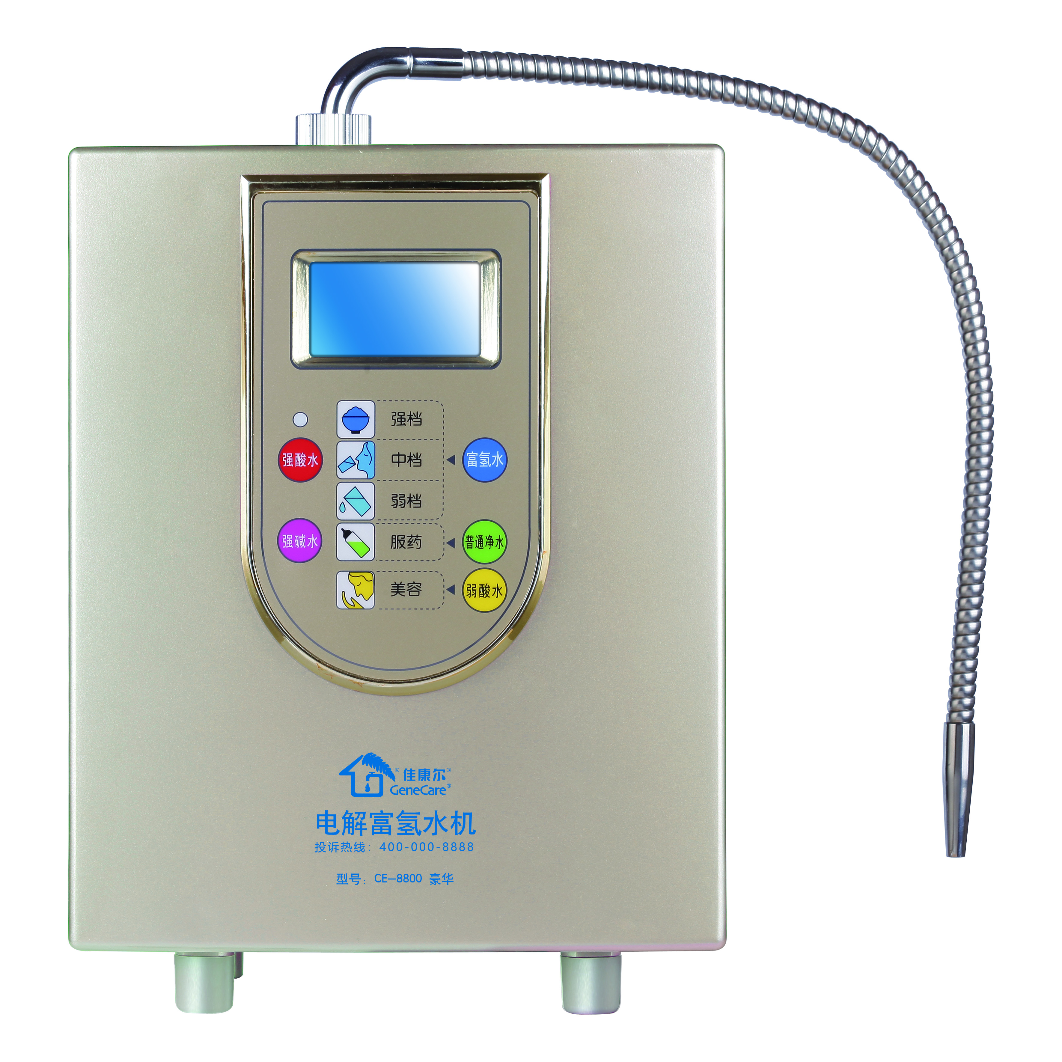 佳康尔CE-8800型电解富氢水机,采用国家发明专利技术(专利号:ZL 2013 10562066. 5 )以及新工艺、新结构、新材料,是对饮用水进行功能化处理的新一代电解装置,具有连续式制水方式、5种产水模式、电解性能强大等显著优势。